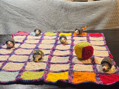A simple game for ages 3+ that can be played alone or with up to 6 players. Game teaches colors, taking turns, sharing, and is very tactile. All handmade and includes game board, dice, and 6 Opossums in each color.